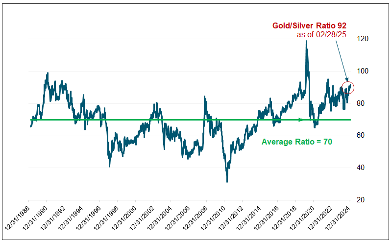 Source: Bloomberg as of 2/28/2025. The silver spot price is measured by the Silver Spot USD/Troy Ounce. *The gold/silver ratio is a measure that indicates how many ounces of silver are needed to purchase one ounce of gold. It is calculated by dividing the current spot price of gold by the current spot price of silver.
