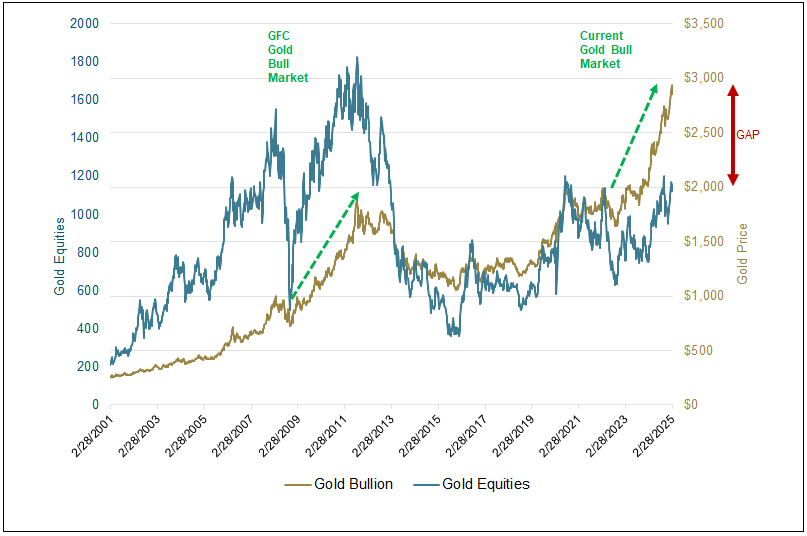 Source: Bloomberg as of 2/28/2025. Gold is measured by the GOLDS Comdty Spot Price and gold equities by the NYSE Arca Gold Miners Index (GDMNTR).2 You cannot invest directly in an index. Past performance is no guarantee of future results.