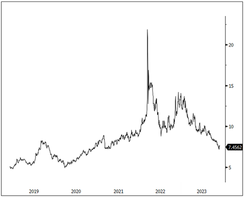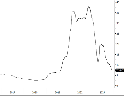 The lithium carbonate spot price continued its sharp descent in November, falling 27.57% for the month to close at $7.34 per pound (see Figure 2). Inventory destocking amid lower-than-expected EV sales has plagued the immature and volatile lithium market. The lithium carbonate spot price has fallen to levels not seen since the first half of 2021, near the beginning of its stupendous rally. (Notably, however, the November-end price of $7.34 per pound was still nearly three times the price in 2020.)