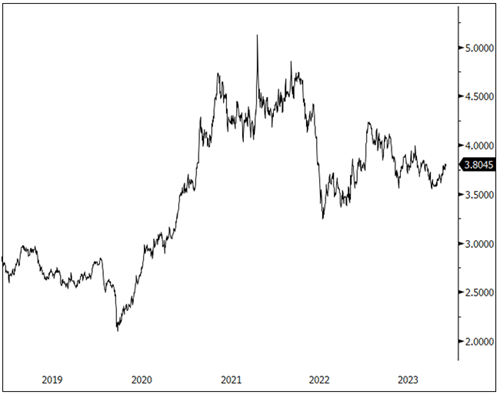 Source: Bloomberg. Copper spot price, $/lb, 2018-2023. Data as of 12/1/2023. Included for illustrative purposes only. Past performance is no guarantee of future results.