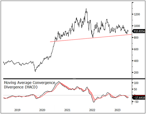 Source: Bloomberg. Nasdaq Sprott Energy Transition Materials Index (2018-2023). Data as of 12/1/2023. Moving average convergence/divergence is a trend-following momentum indicator that shows the relationship between two exponential moving averages (EMAs), calculated by subtracting the 26-period EMA from the 12-period EMA. Included for illustrative purposes only. Past performance is no guarantee of future results.