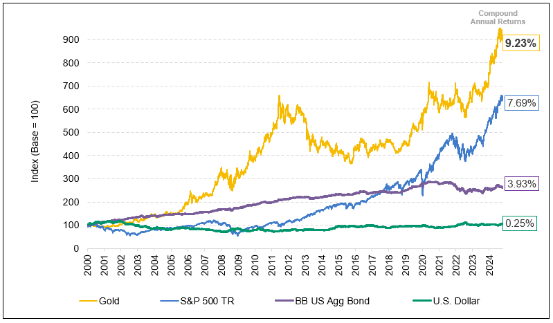 Source: Bloomberg. Period from 12/31/1999 to 12/31/2024. Gold is measured by GOLDS Comdty Spot Price; S&P 500 TR is measured by the SPX; US Agg Bond Index is measured by the Bloomberg Barclays US Agg Total Return Value Unhedged USD (LBUSTRUU Index); and the U.S. Dollar is measured by DXY Curncy. Past performance is no guarantee of future results.