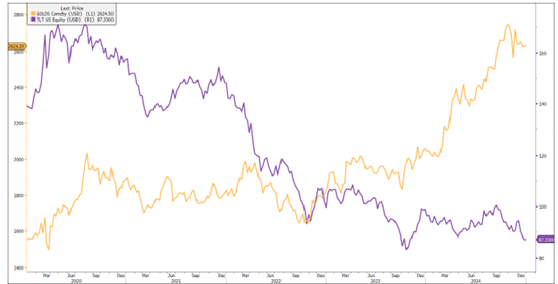 Source: Bloomberg. Data as of 12/31/2024. Gold is represented by the gold line; TLT Bond ETF is represented by the purple line.