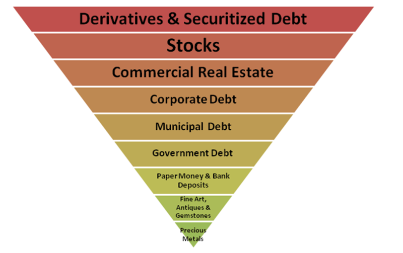 Third, the highly liquid paper gold trade rests on a shaky foundation, best imagined by John Exter*, as an inverted pyramid (see Figure 8). Paper gold includes all contracts traded between bullion banks and their clients in the form of swaps, options, futures and other derivatives. According to the LBMA, the daily trading volume of gold in 2024 was 33 million ounces or $80 billion compared to annual gold production of 120,000,000 ounces or $324 billion (2024 prices).