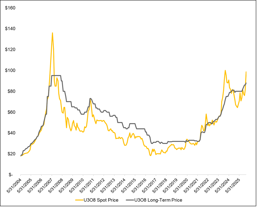 Source: Bloomberg and UxC. Data as of 1/31/2026. U3O8 Spot Price is measured by the UxC Uranium U3O8 Spot Price (UXCPU308 UXCP Index), and U3O8 Long Term Price is measured by the UxC Uranium U3O8 Long-Term Price (UXCPULTM UXCP Index). You cannot invest directly in an index. Included for illustrative purposes only. Past performance is no guarantee of future results.